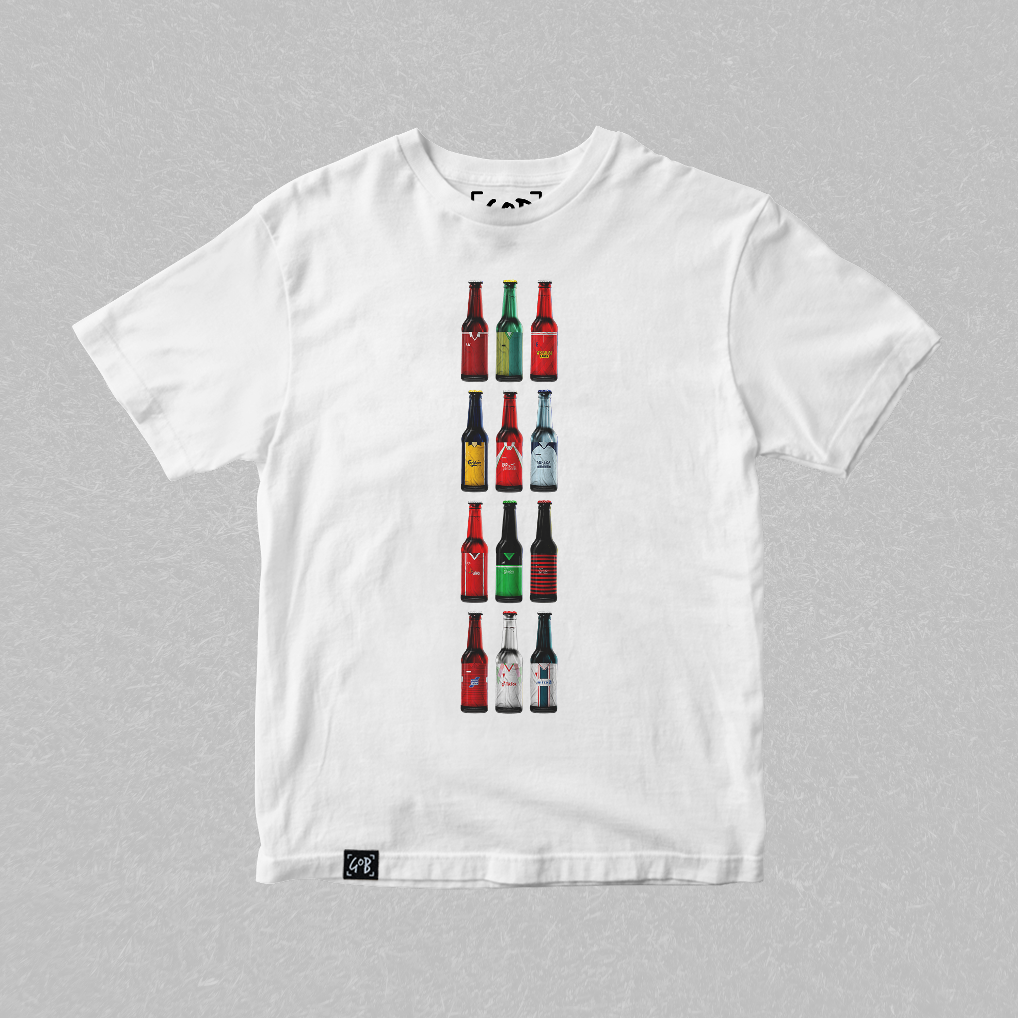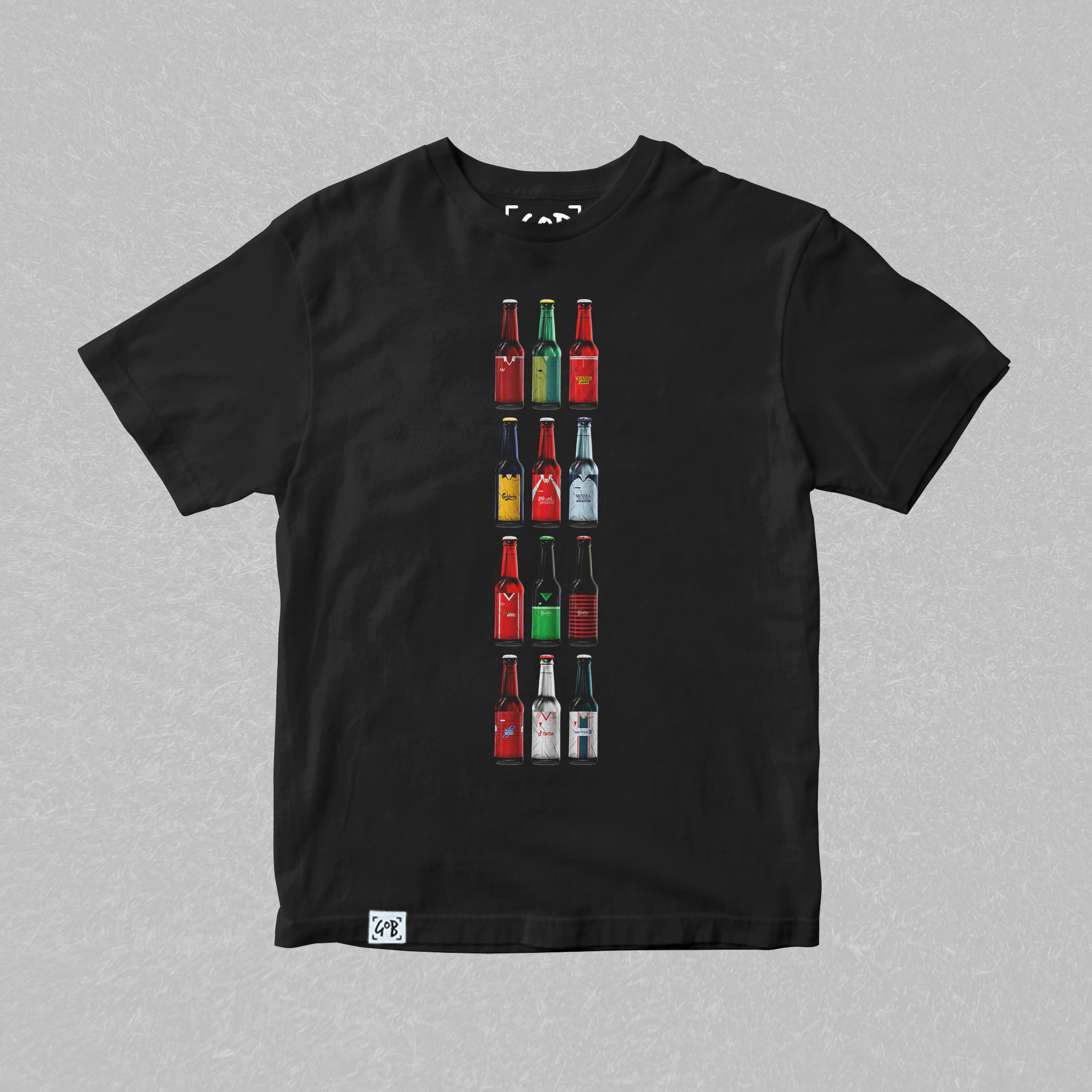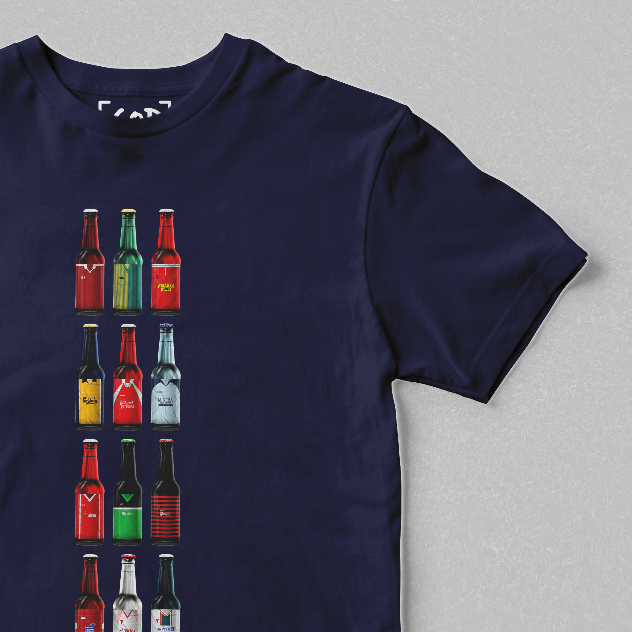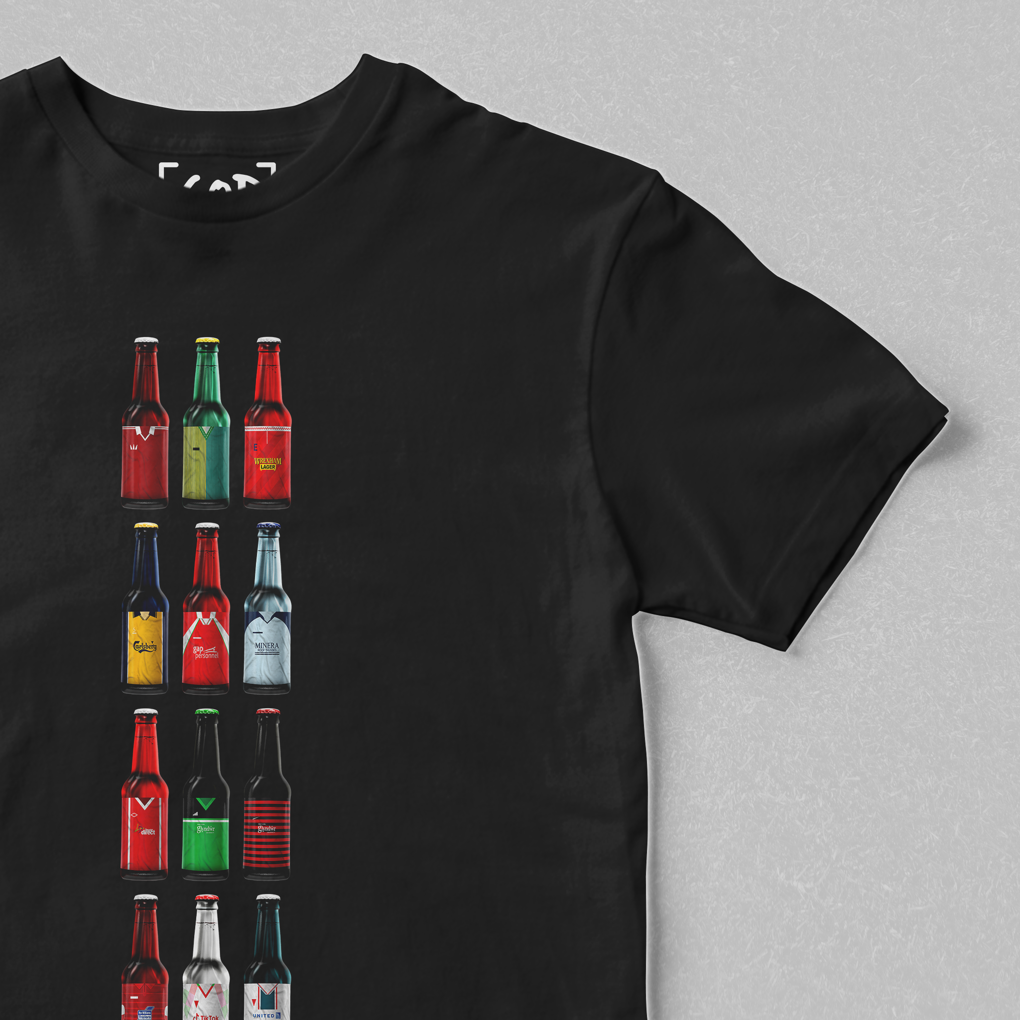 Twelve iconic kits from your club’s past, reimagined as collectible beer bottles in a bold, fan-made design. Each bottle tells a story — of unforgettable goals, cult heroes, and matchdays etched into football history. Crafted for supporters who carry the legacy, this tee is a wearable celebration of heritage, pride, and pints.