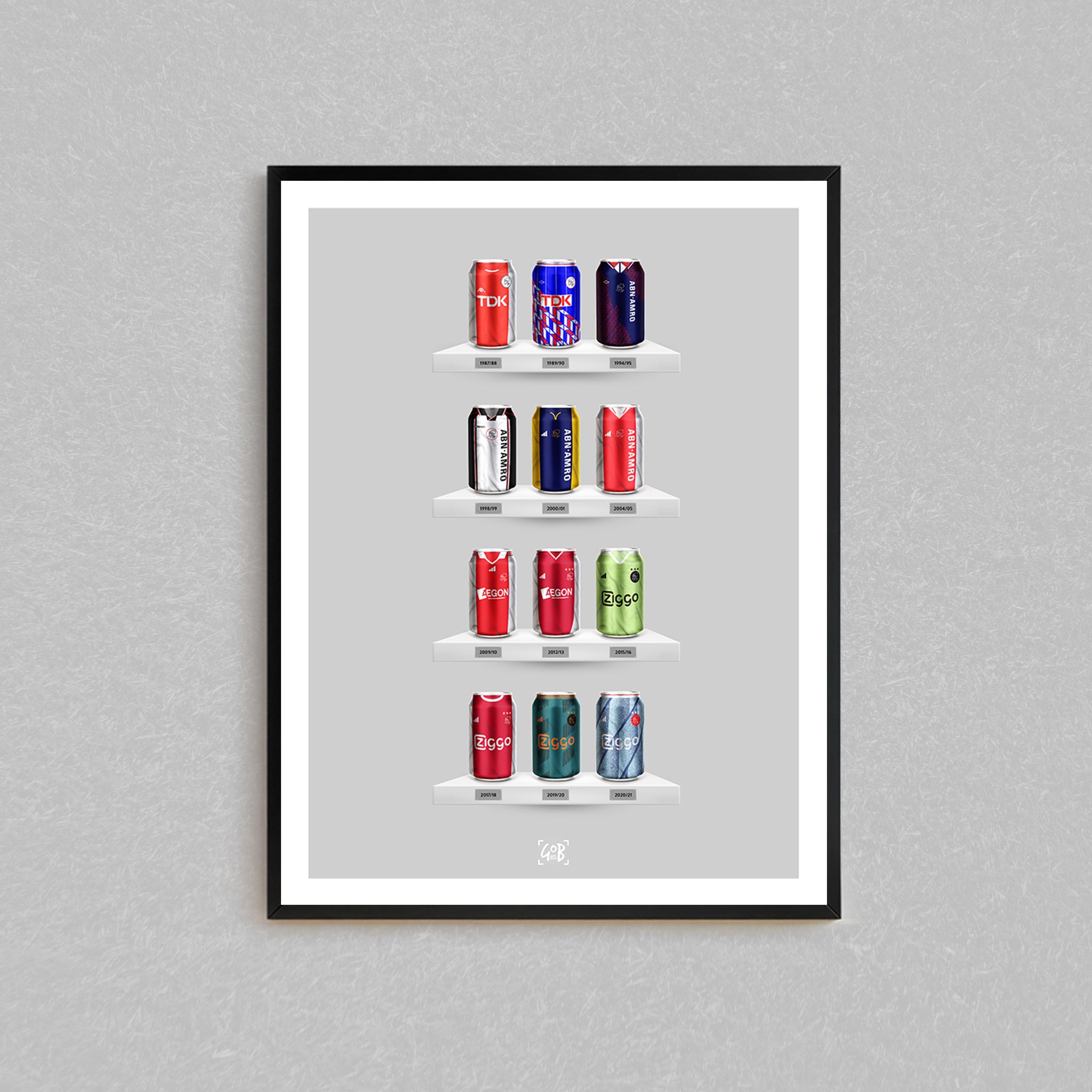 Celebrate legendary football kits from the past few decades, each one digitally illustrated in your choice of our unique can or bottle styles. Printed in high-definition on premium gloss paper, these designs are made to stand out, whether framed or displayed as they are. Also available as a matching T-shirt