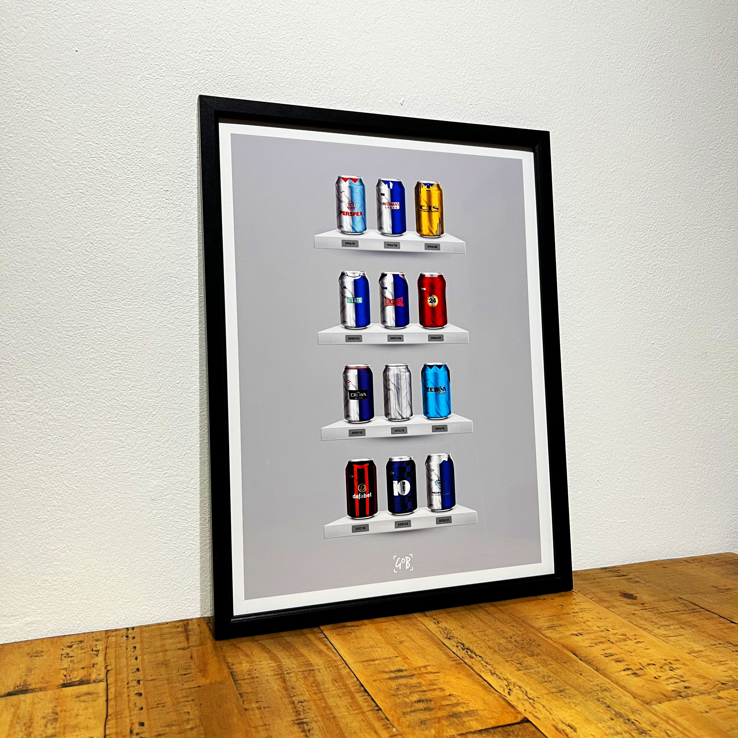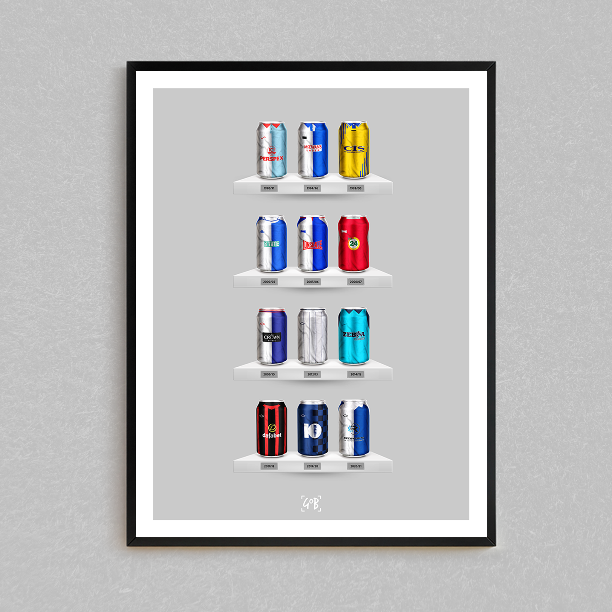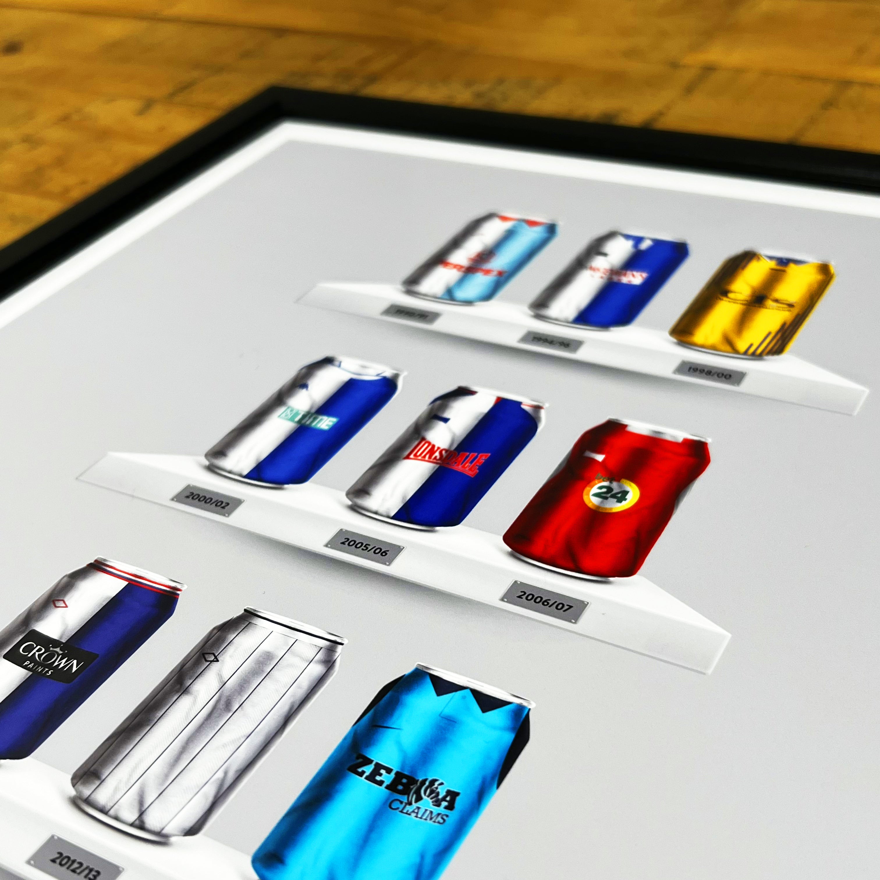 Celebrate legendary football kits from the past few decades, each one digitally illustrated in your choice of our unique can or bottle styles. Printed in high-definition on premium gloss paper, these designs are made to stand out, whether framed or displayed as they are. Also available as a matching T-shirt