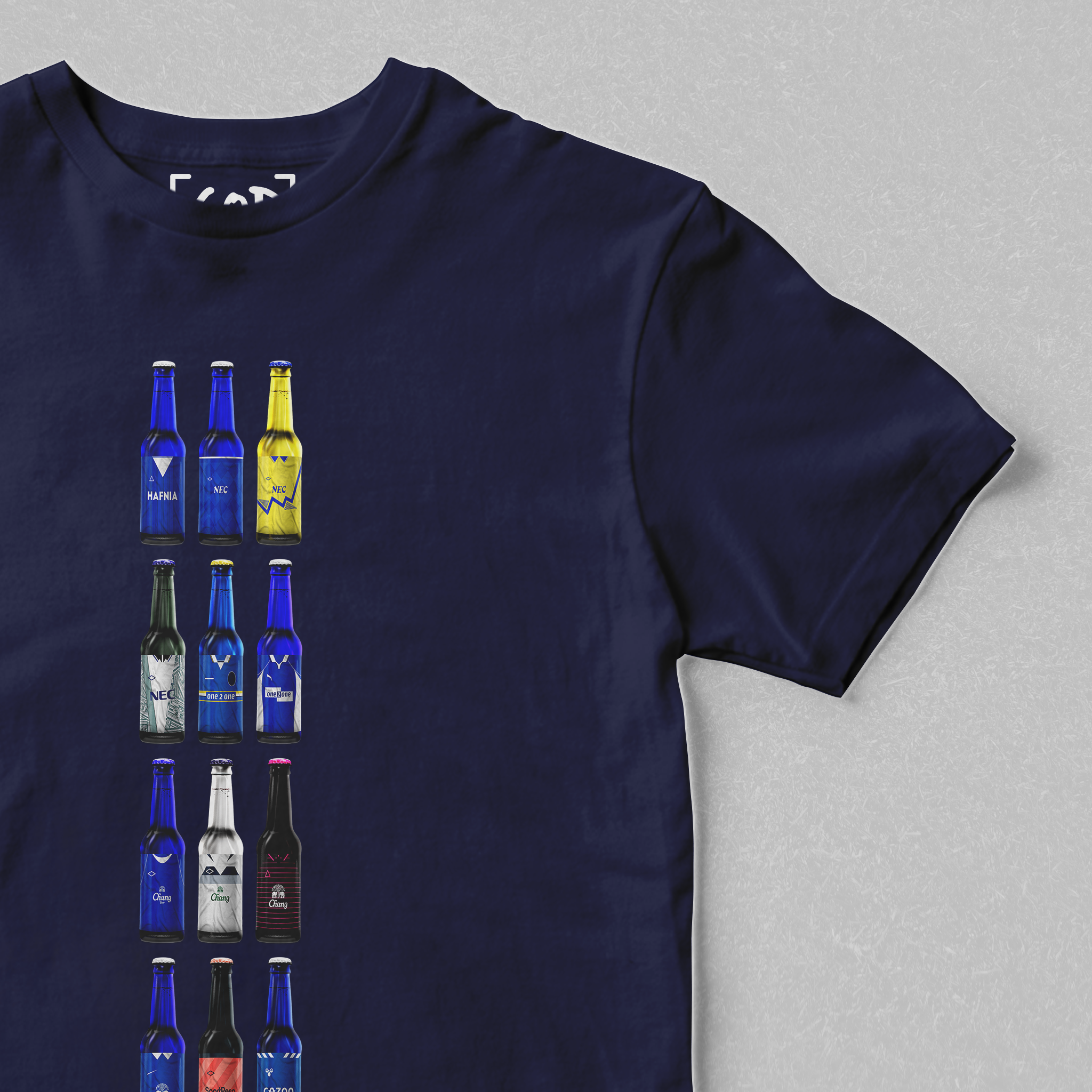 Twelve iconic kits from your club’s past, reimagined as collectible beer bottles in a bold, fan-made design. Each bottle tells a story — of unforgettable goals, cult heroes, and matchdays etched into football history. Crafted for supporters who carry the legacy, this tee is a wearable celebration of heritage, pride, and pints.