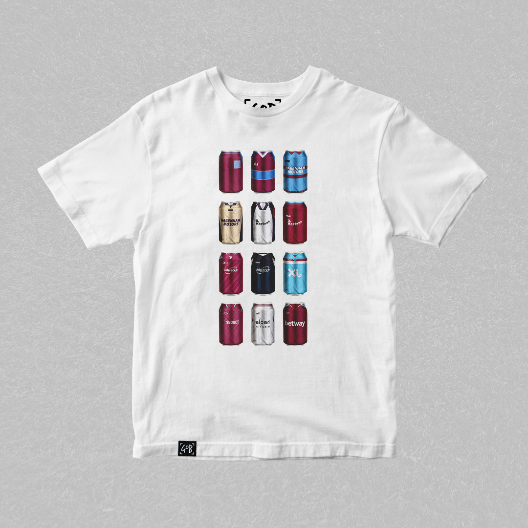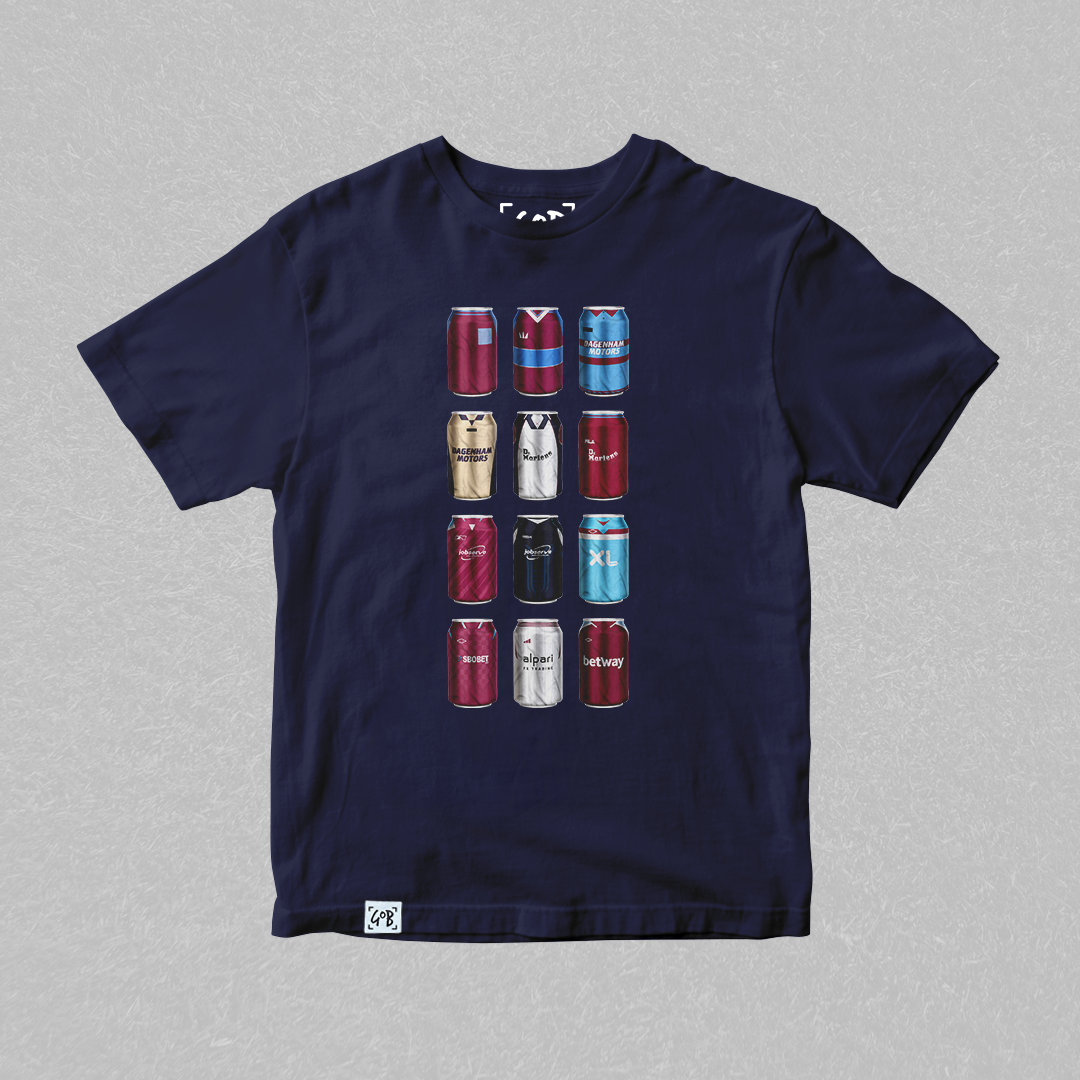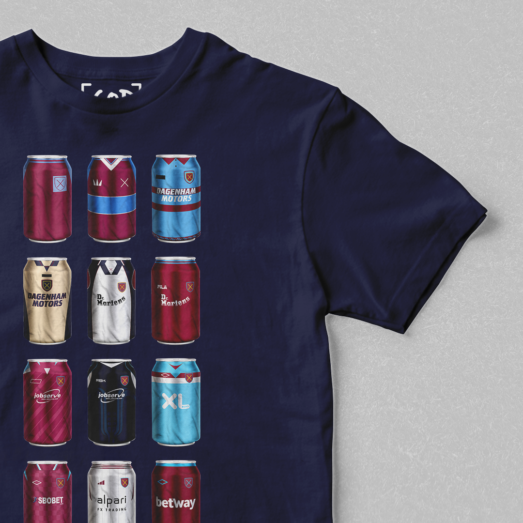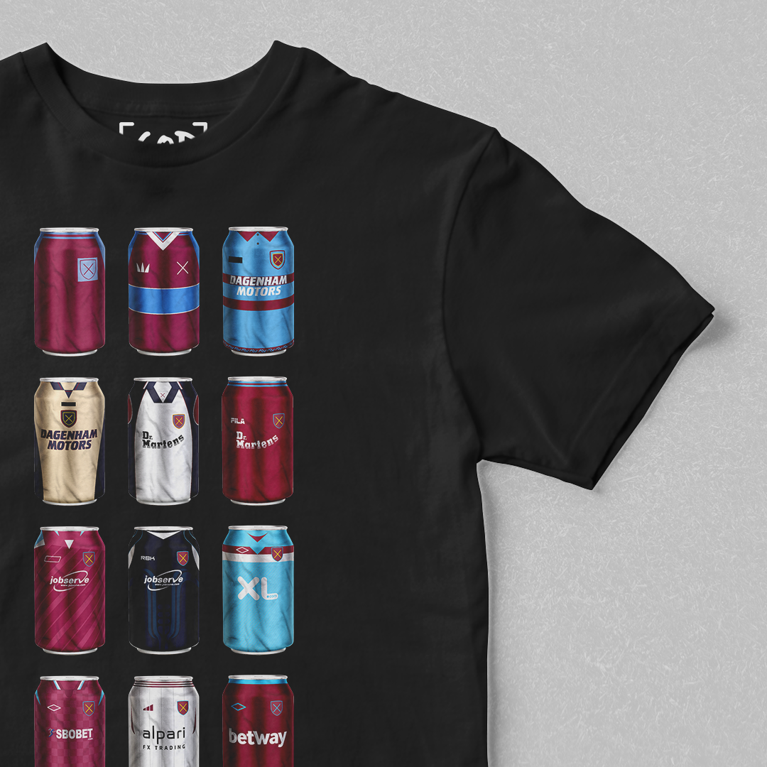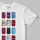 Twelve iconic kits from your club’s past, reimagined as collectible beer cans in a bold, fan-made design. Each can tells a story — of unforgettable goals, cult heroes, and matchdays etched into football history. Crafted for supporters who carry the legacy, this tee is a wearable celebration of heritage, pride, and pints.