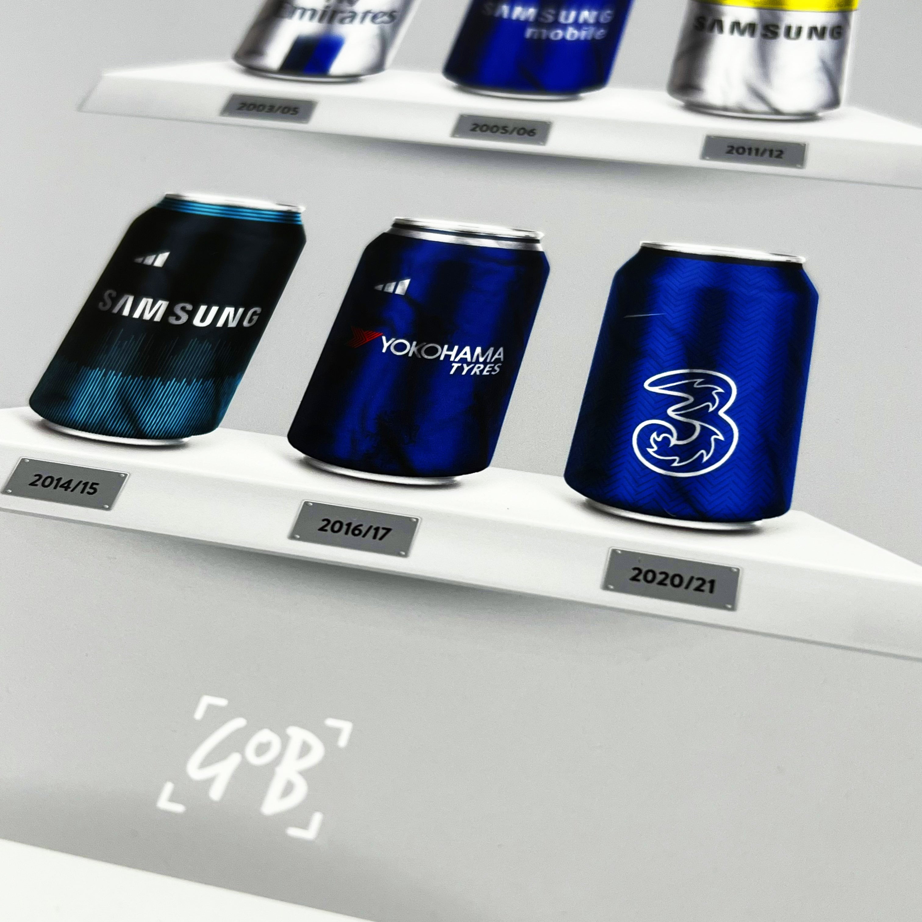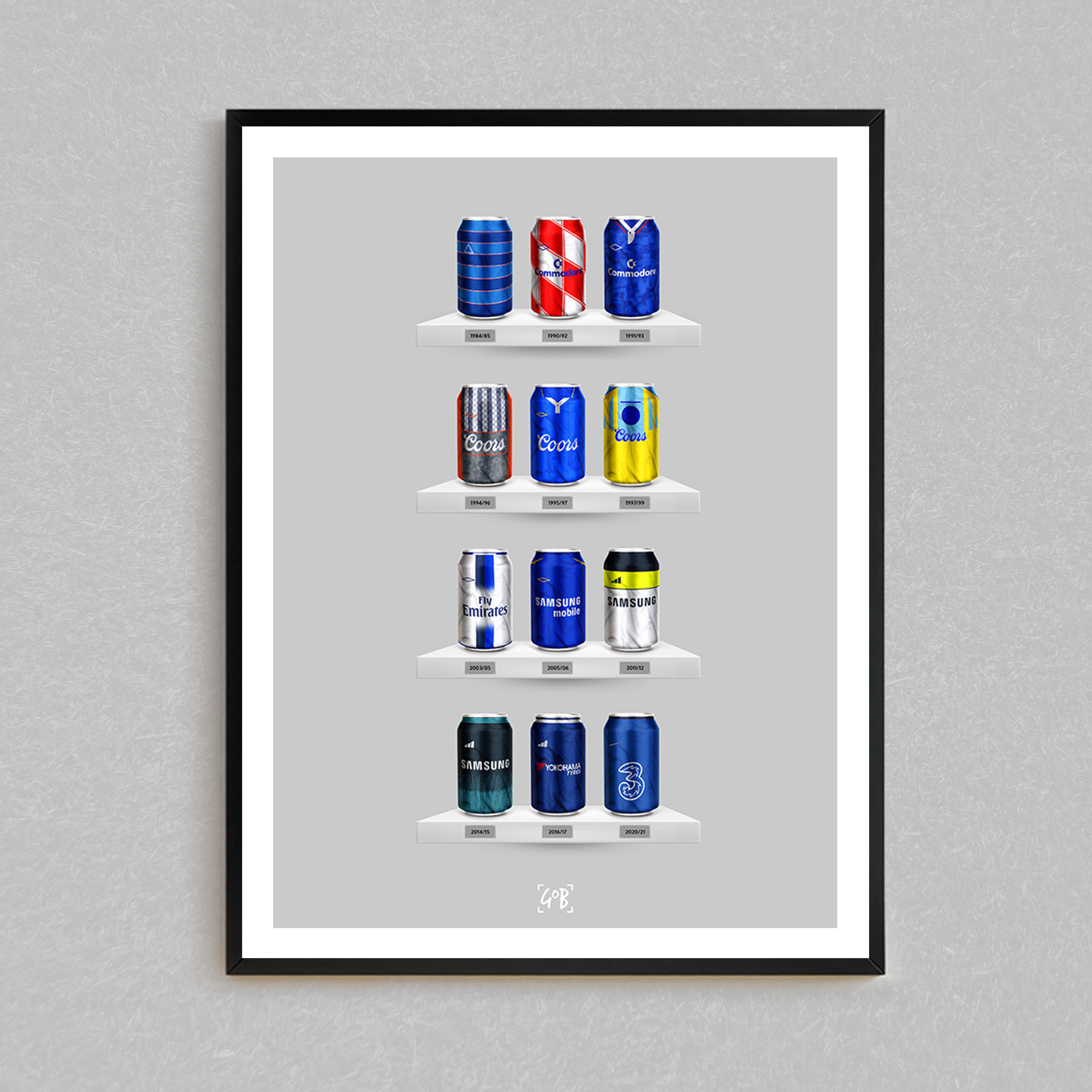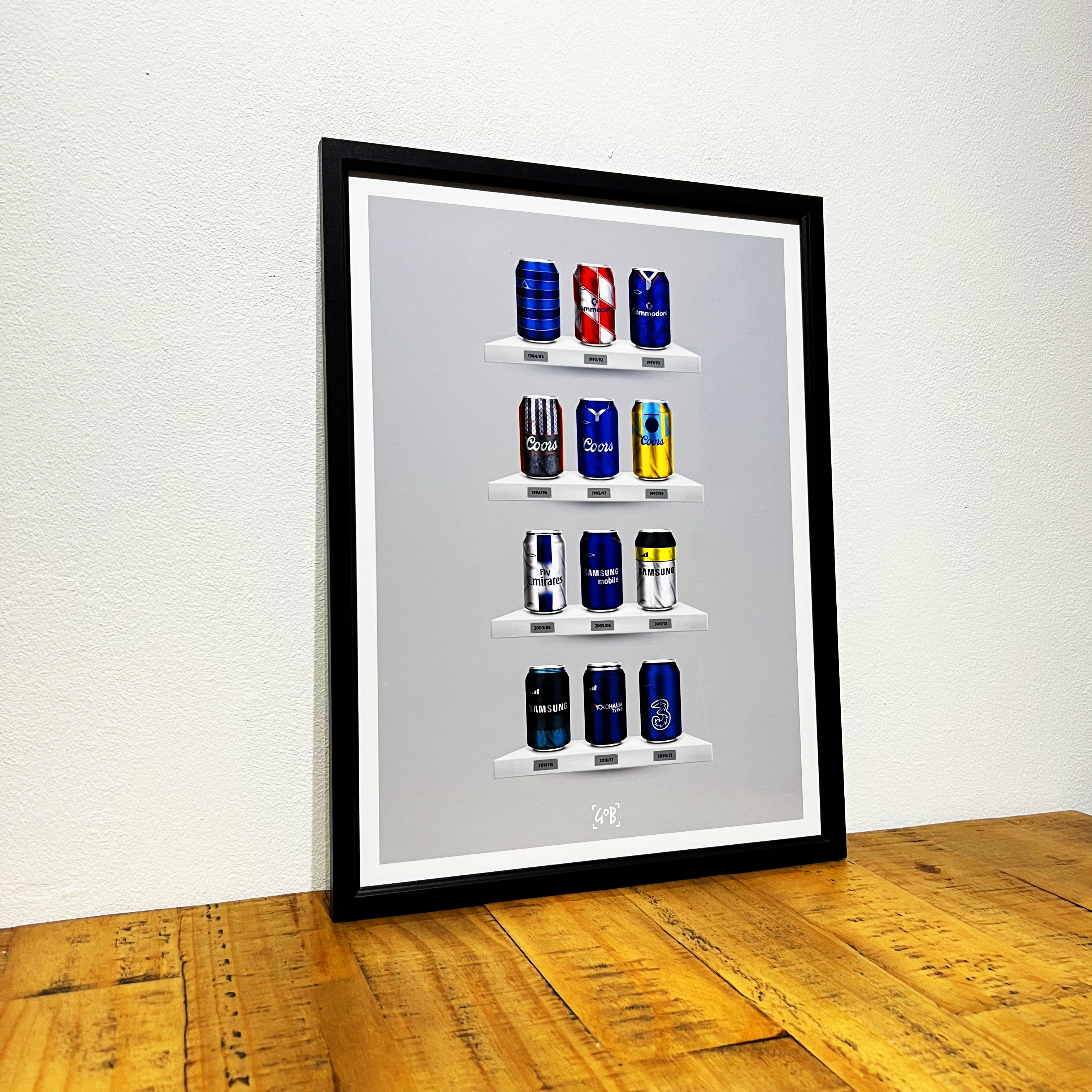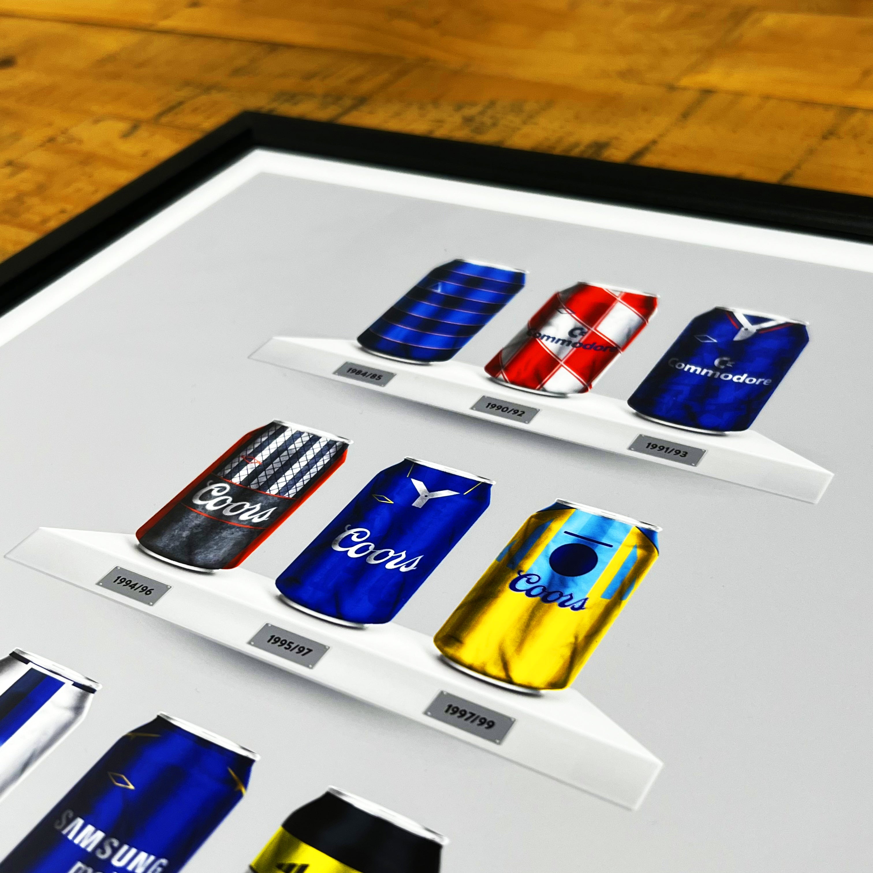 Celebrate legendary football kits from the past few decades, each one digitally illustrated in your choice of our unique can or bottle styles. Printed in high-definition on premium gloss paper, these designs are made to stand out, whether framed or displayed as they are. Also available as a matching T-shirt