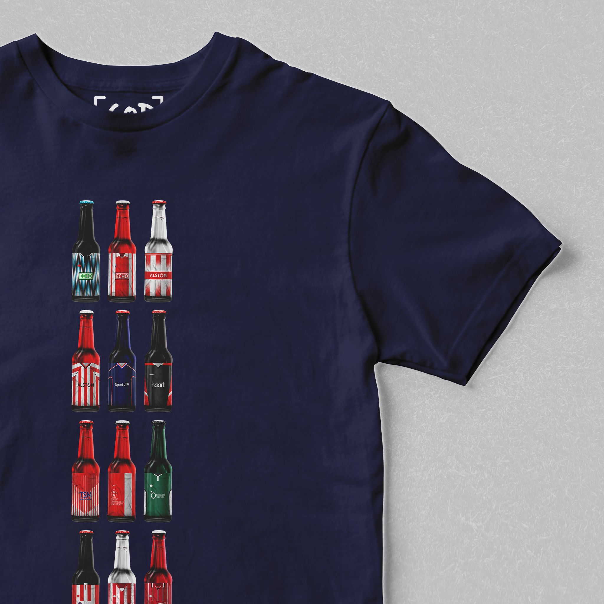 Twelve iconic kits from your club’s past, reimagined as collectible beer bottles in a bold, fan-made design. Each bottle tells a story — of unforgettable goals, cult heroes, and matchdays etched into football history. Crafted for supporters who carry the legacy, this tee is a wearable celebration of heritage, pride, and pints.