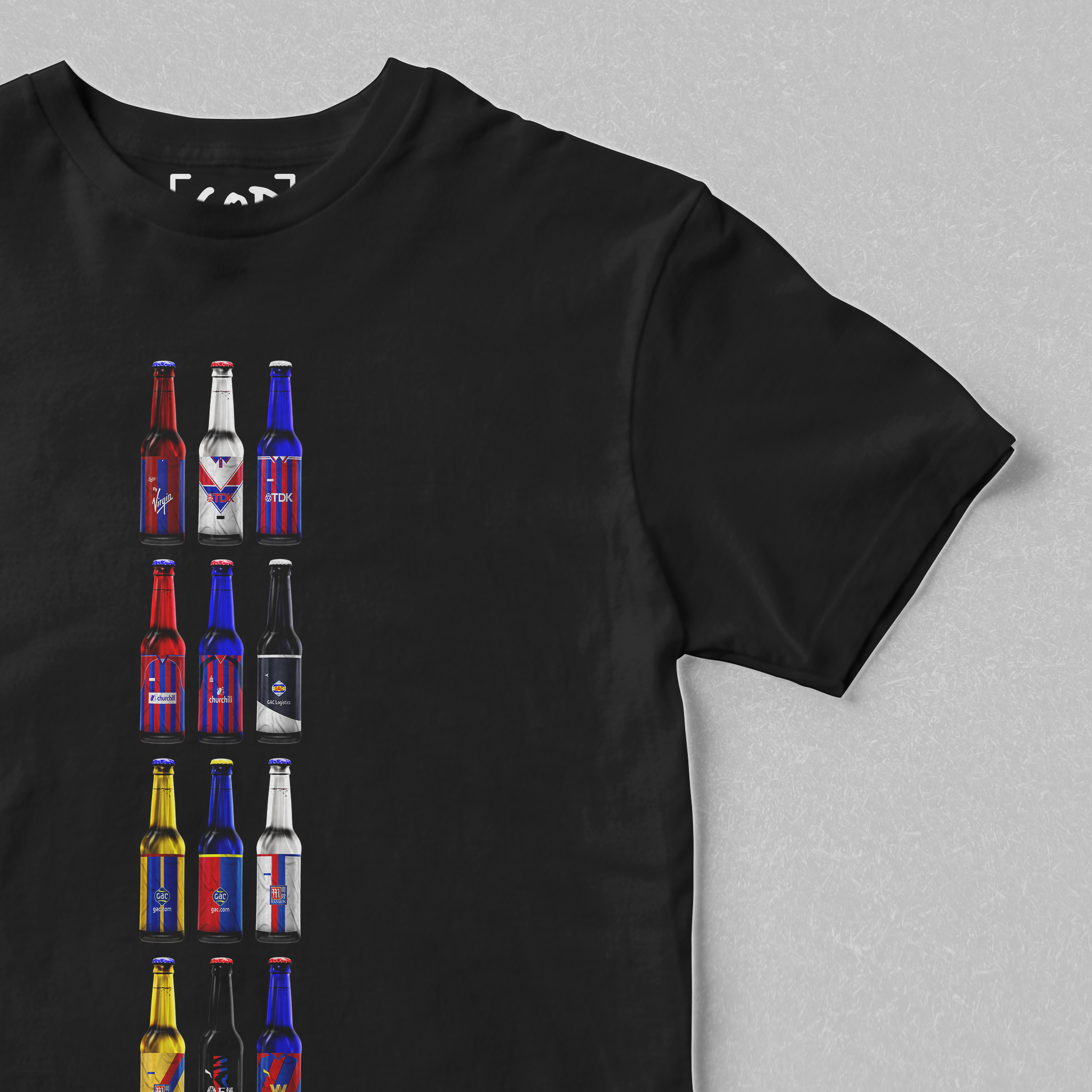 Twelve iconic kits from your club’s past, reimagined as collectible beer bottles in a bold, fan-made design. Each bottle tells a story — of unforgettable goals, cult heroes, and matchdays etched into football history. Crafted for supporters who carry the legacy, this tee is a wearable celebration of heritage, pride, and pints.