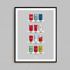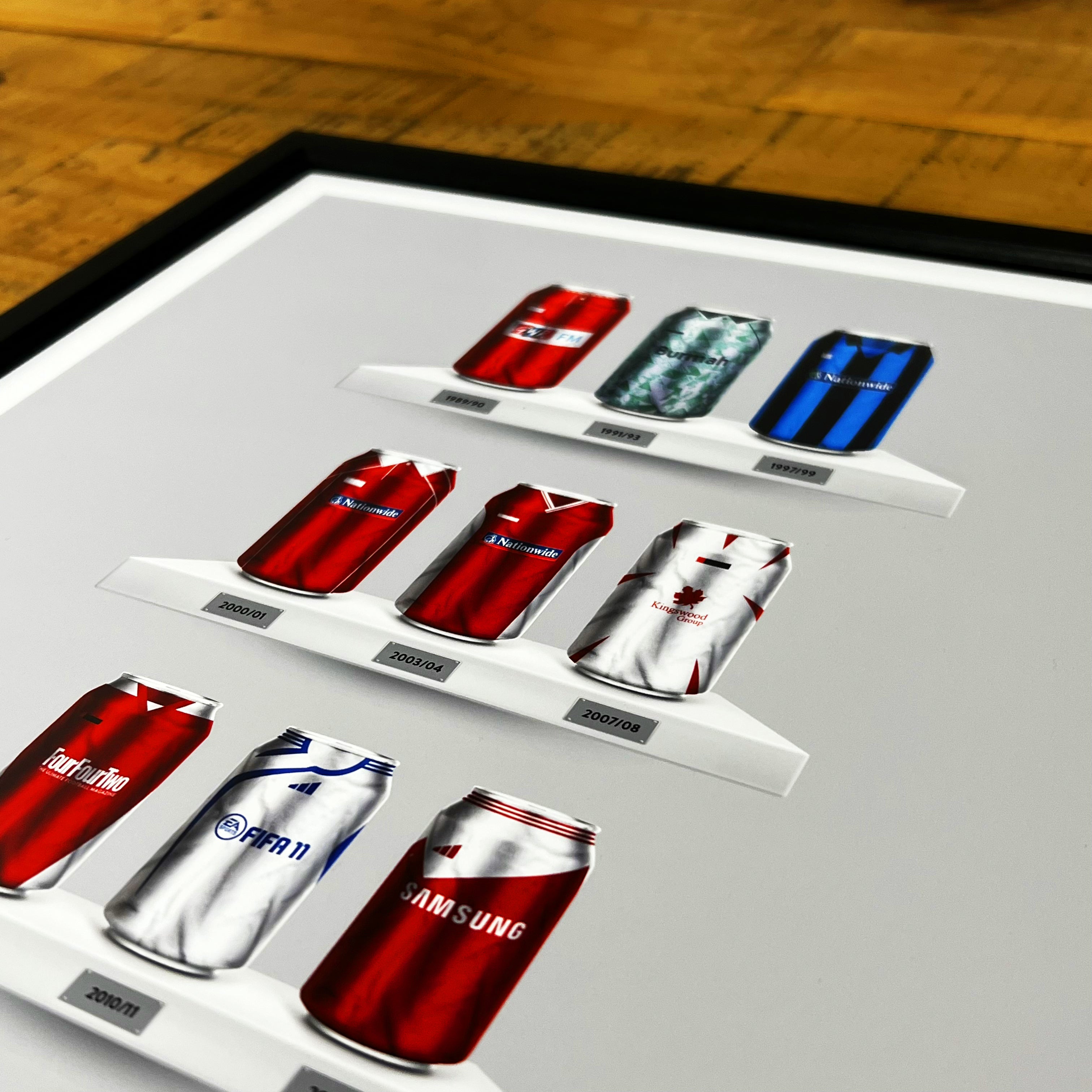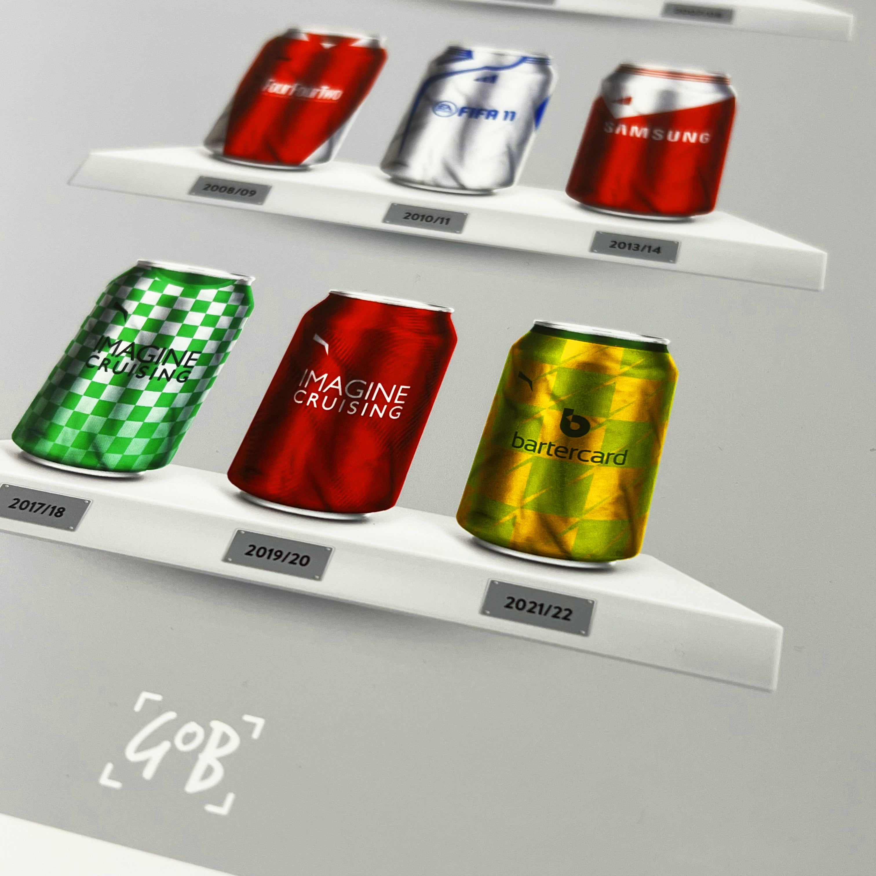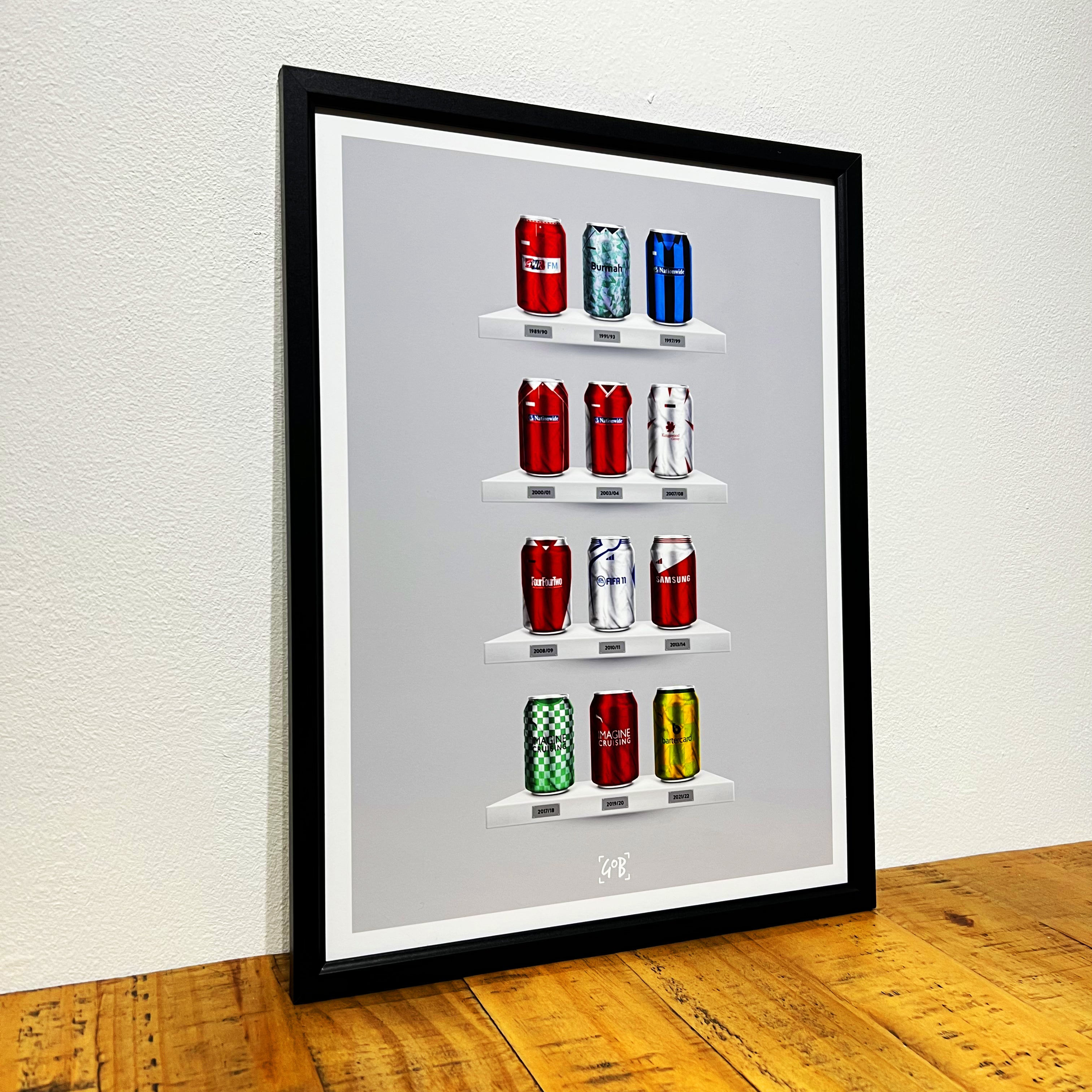 Celebrate legendary football kits from the past few decades, each one digitally illustrated in your choice of our unique can or bottle styles. Printed in high-definition on premium gloss paper, these designs are made to stand out, whether framed or displayed as they are. Also available as a matching T-shirt