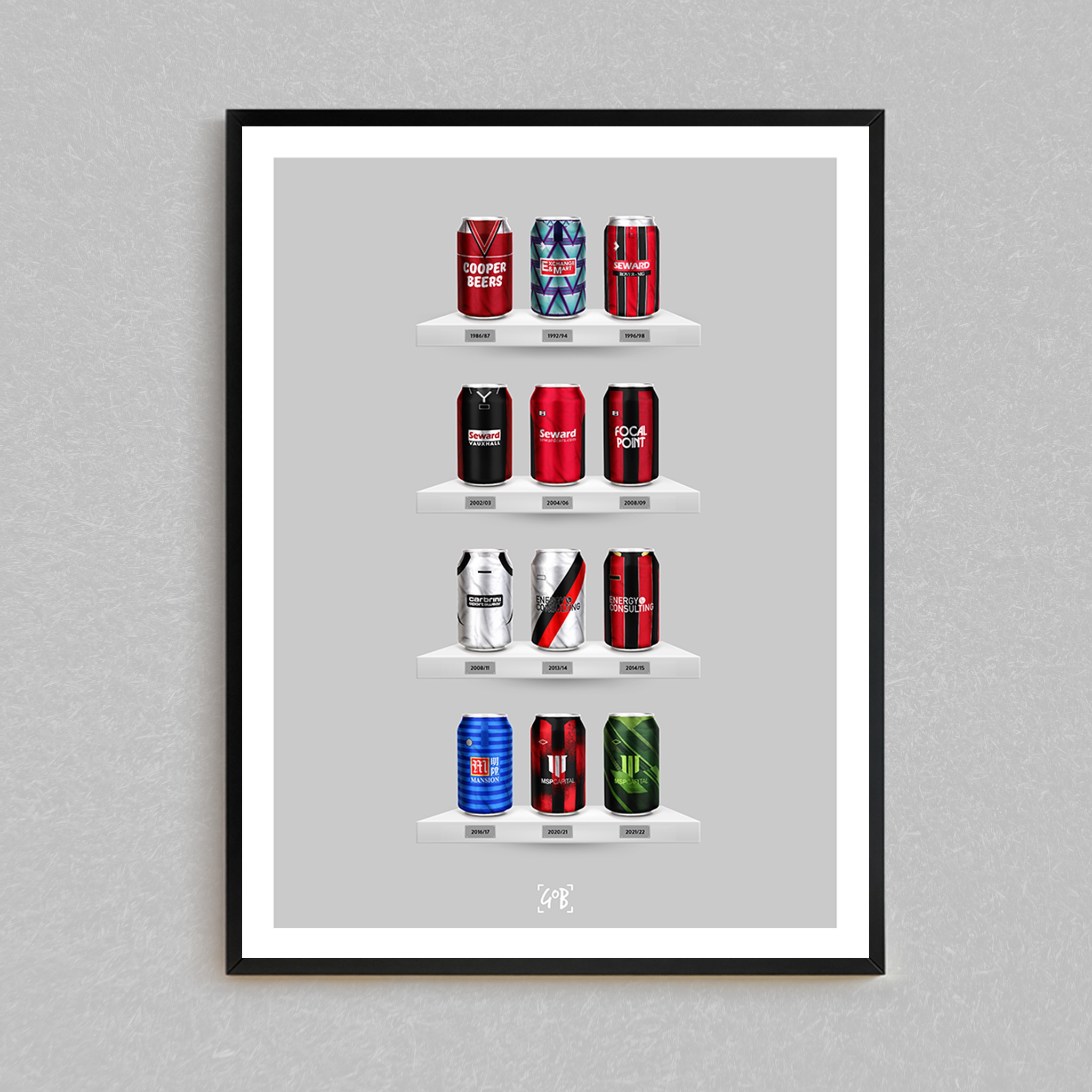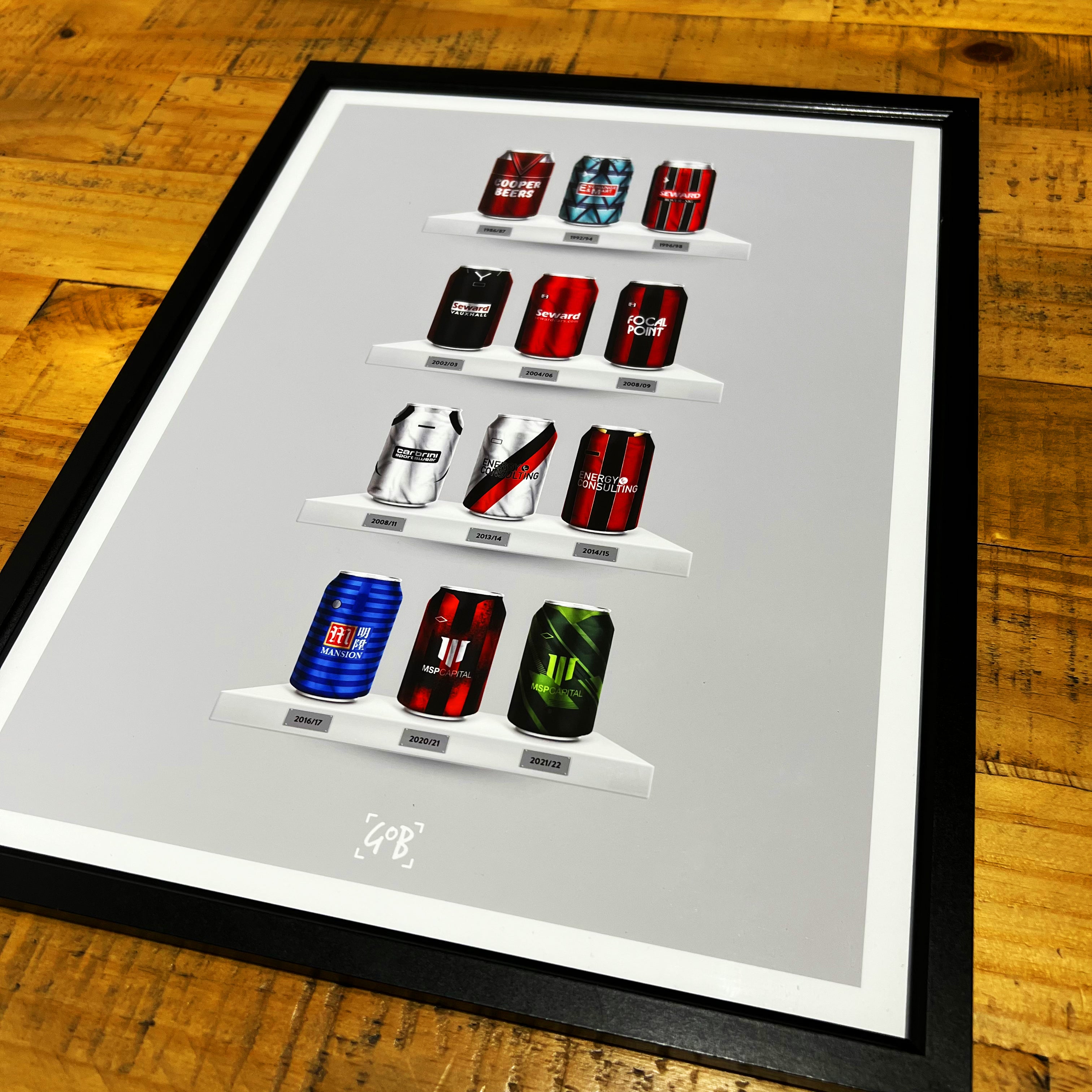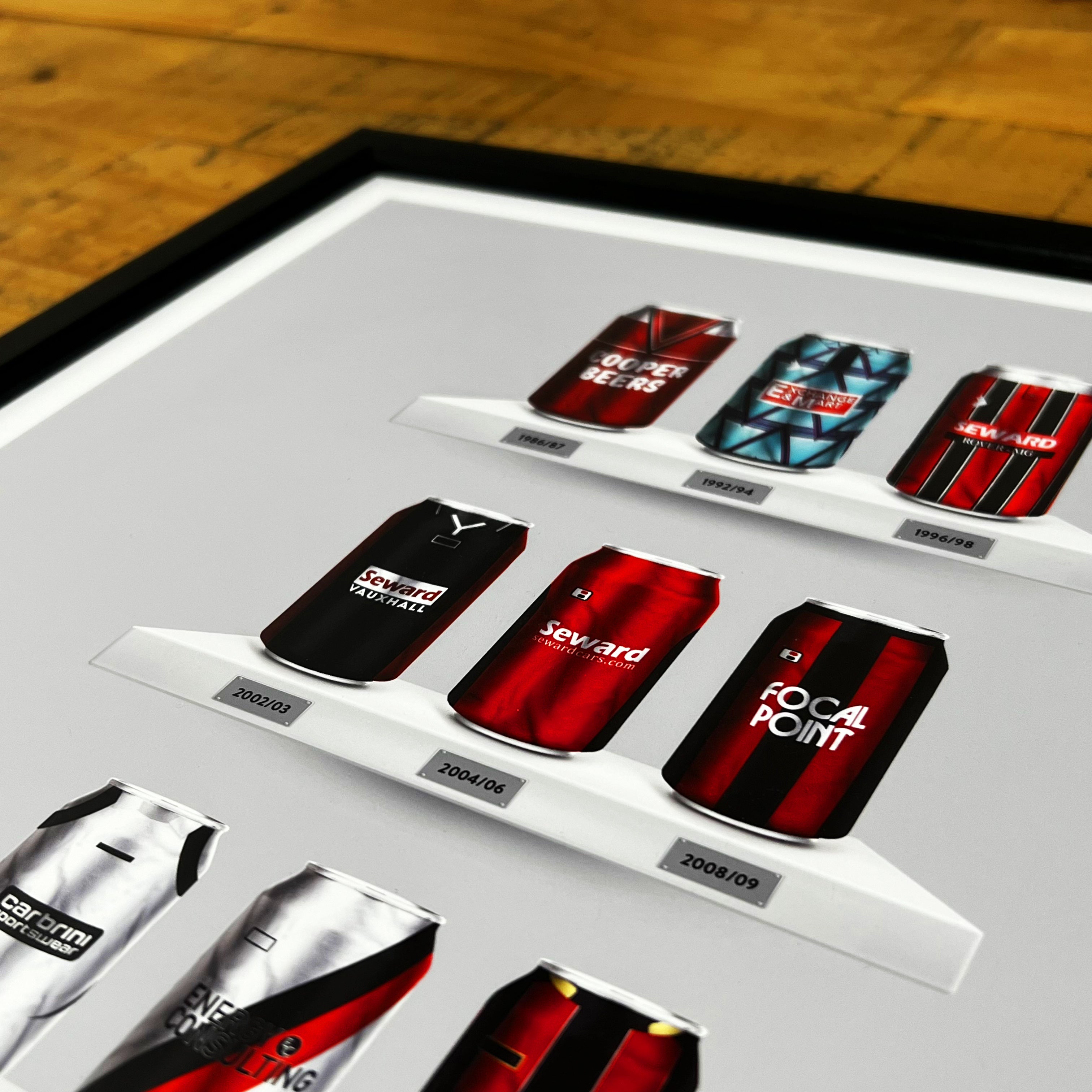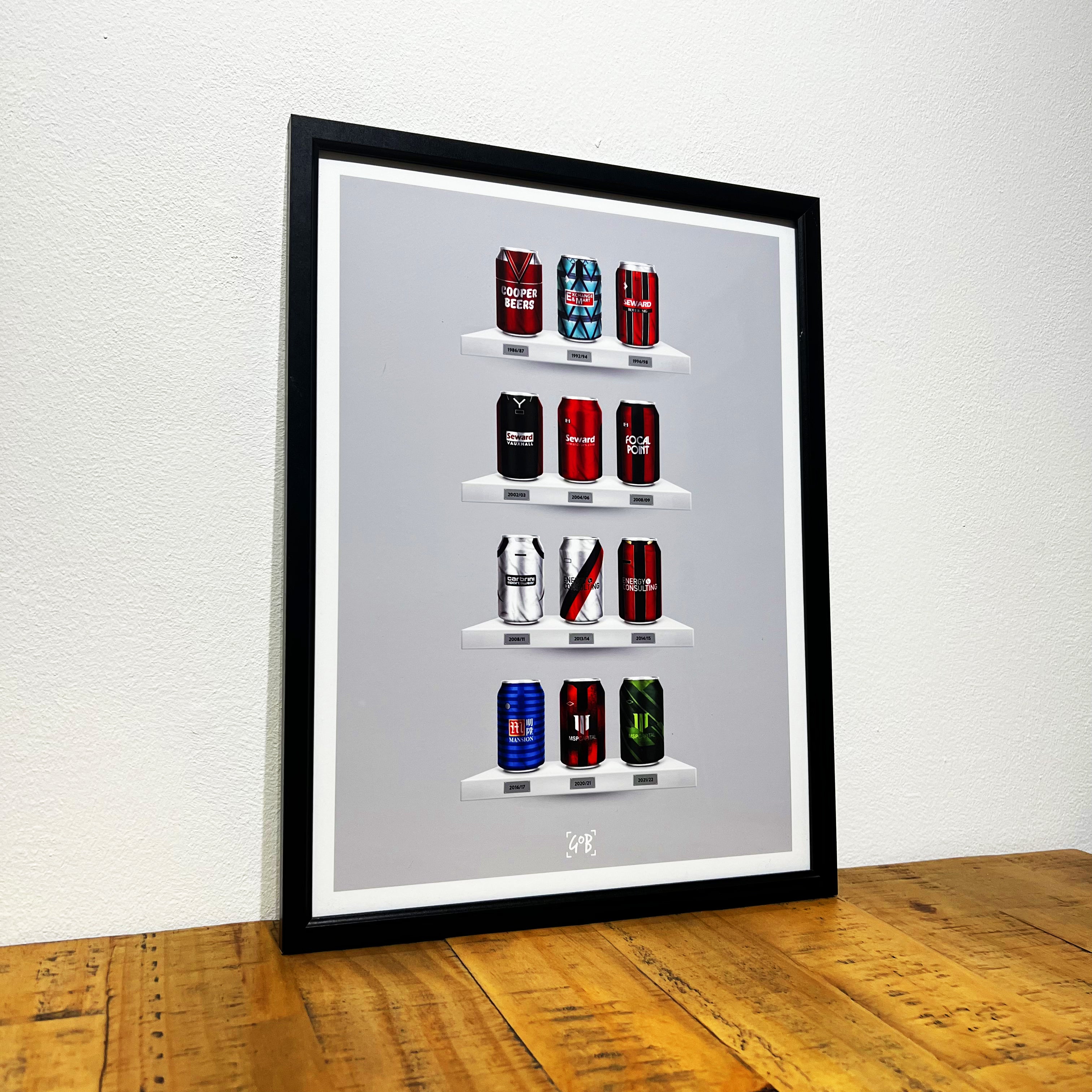 Celebrate legendary football kits from the past few decades, each one digitally illustrated in your choice of our unique can or bottle styles. Printed in high-definition on premium gloss paper, these designs are made to stand out, whether framed or displayed as they are. Also available as a matching T-shirt