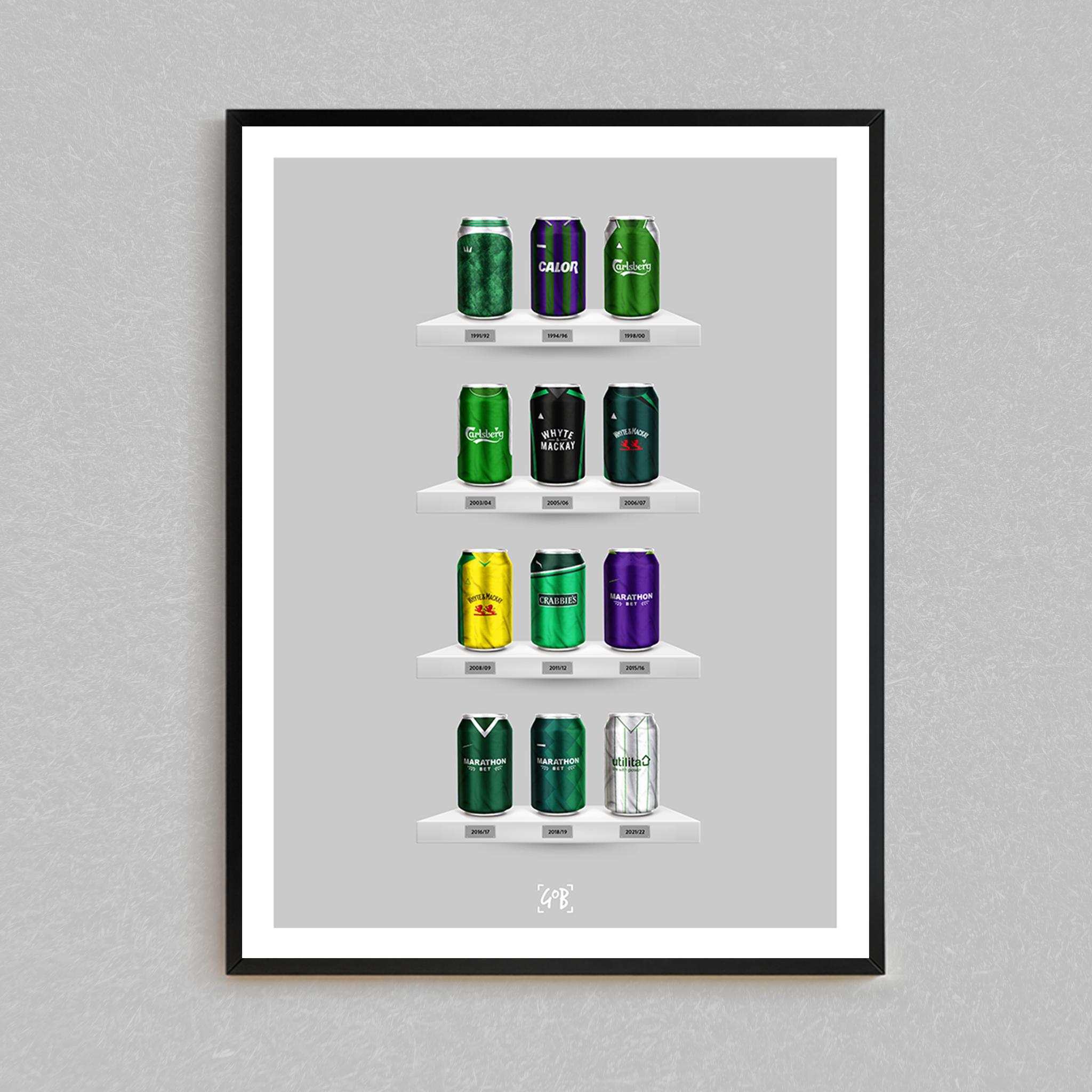 Celebrate legendary football kits from the past few decades, each one digitally illustrated in your choice of our unique can or bottle styles. Printed in high-definition on premium gloss paper, these designs are made to stand out, whether framed or displayed as they are. Also available as a matching T-shirt