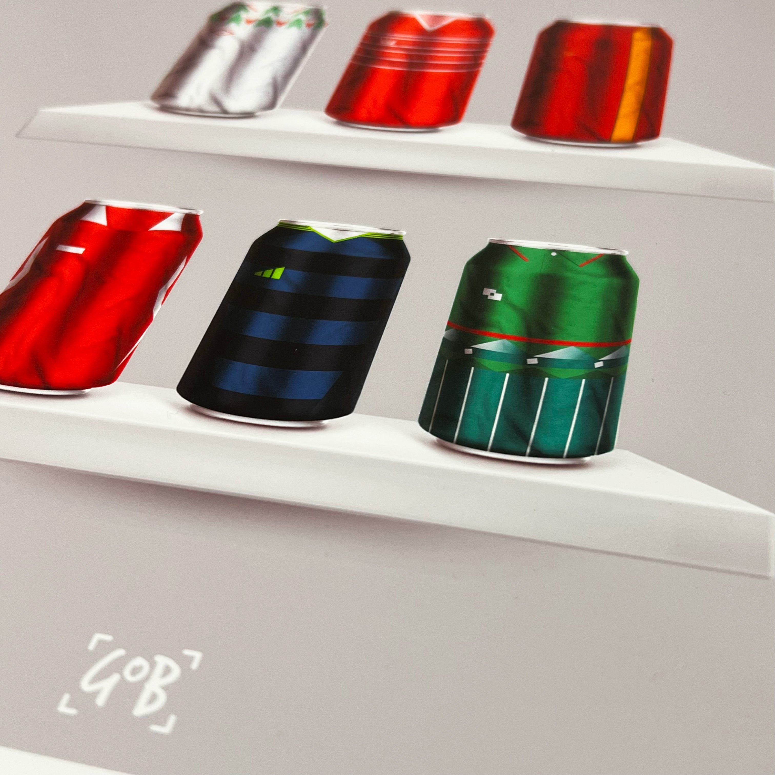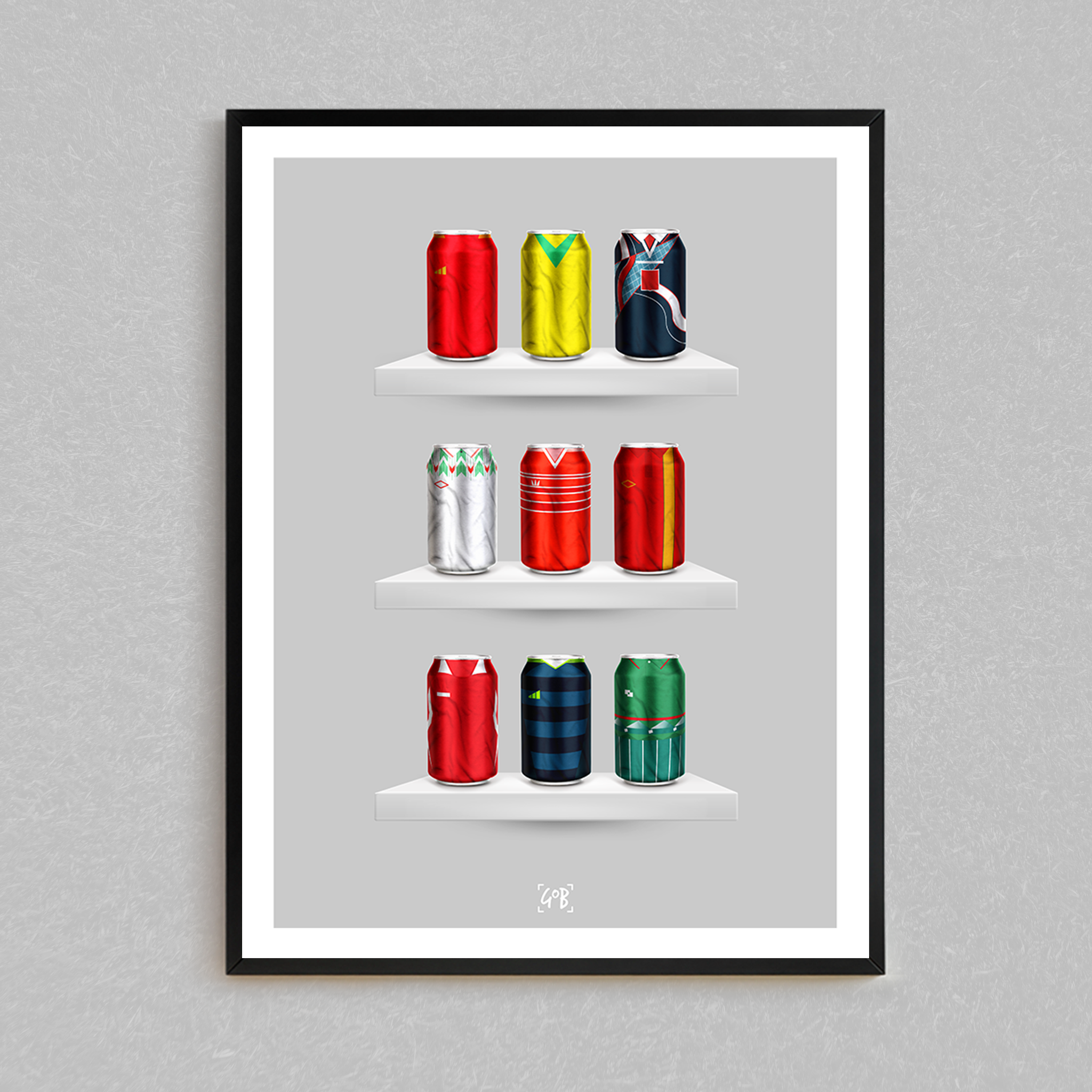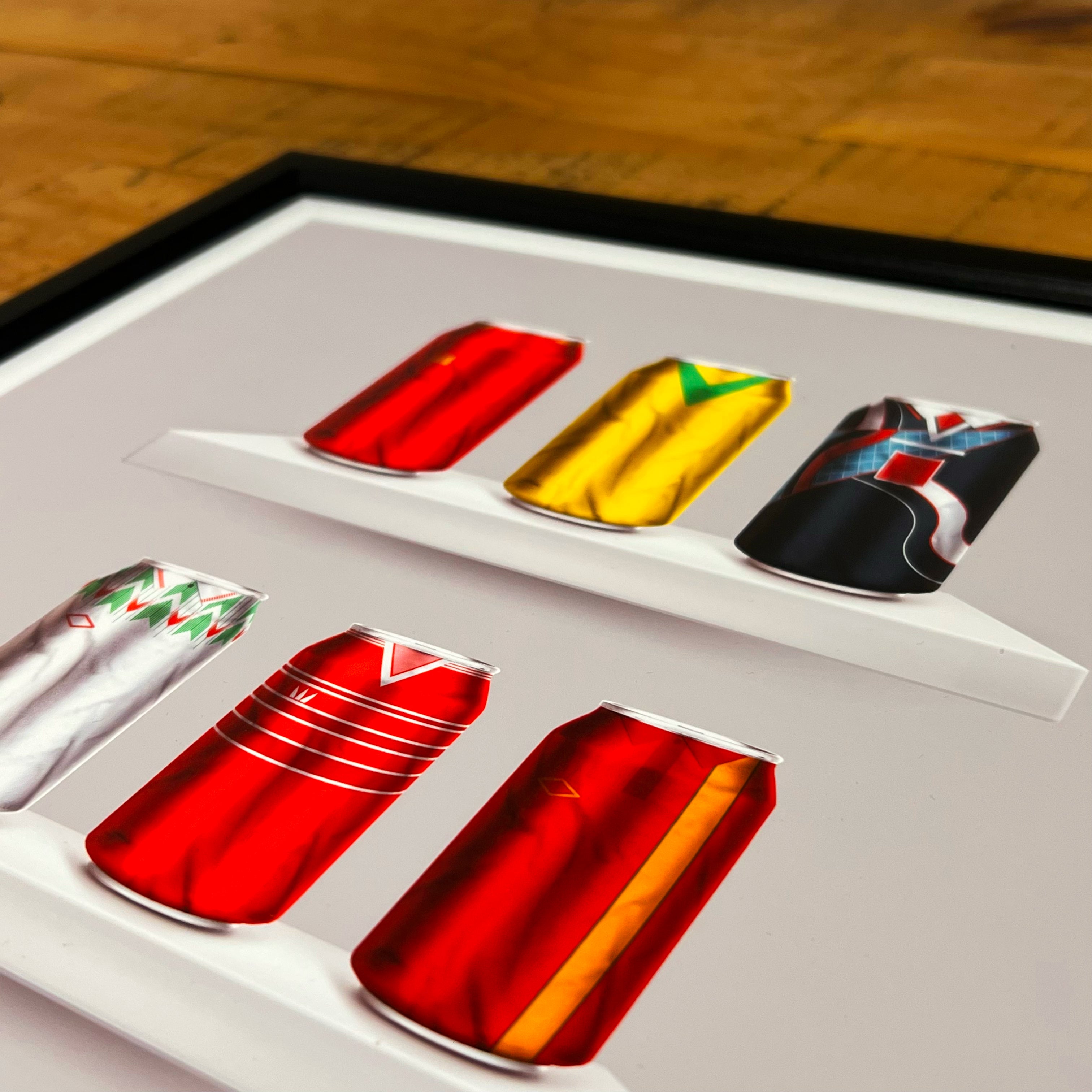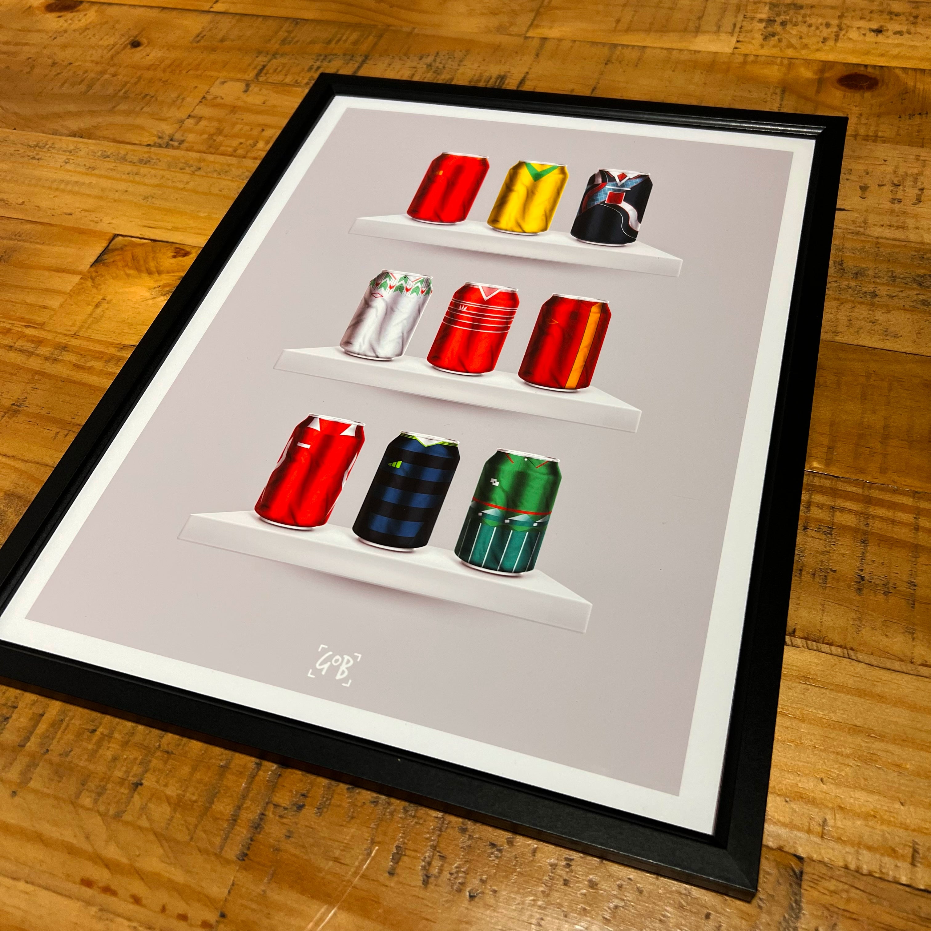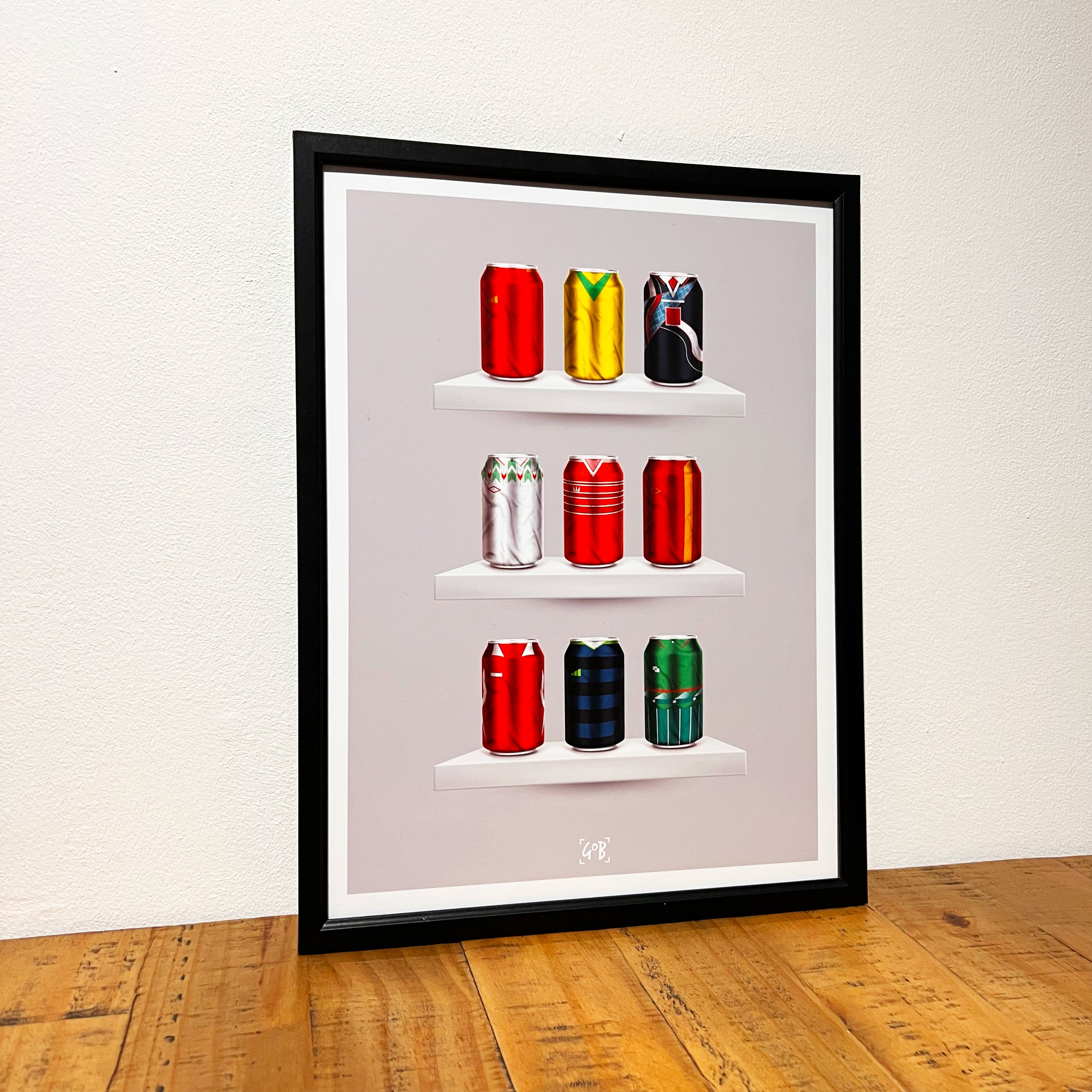 Celebrate legendary football kits from the past few decades, each one digitally illustrated in your choice of our unique can or bottle styles. Printed in high-definition on premium gloss paper, these designs are made to stand out, whether framed or displayed as they are. Also available as a matching T-shirt